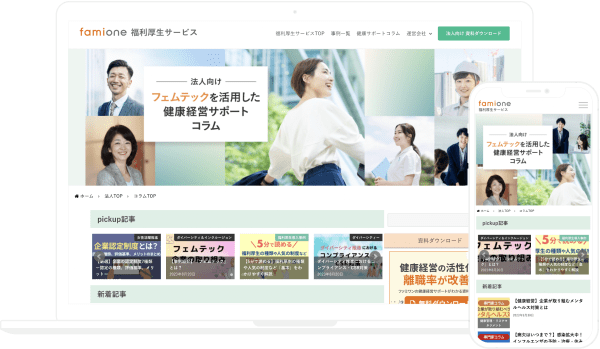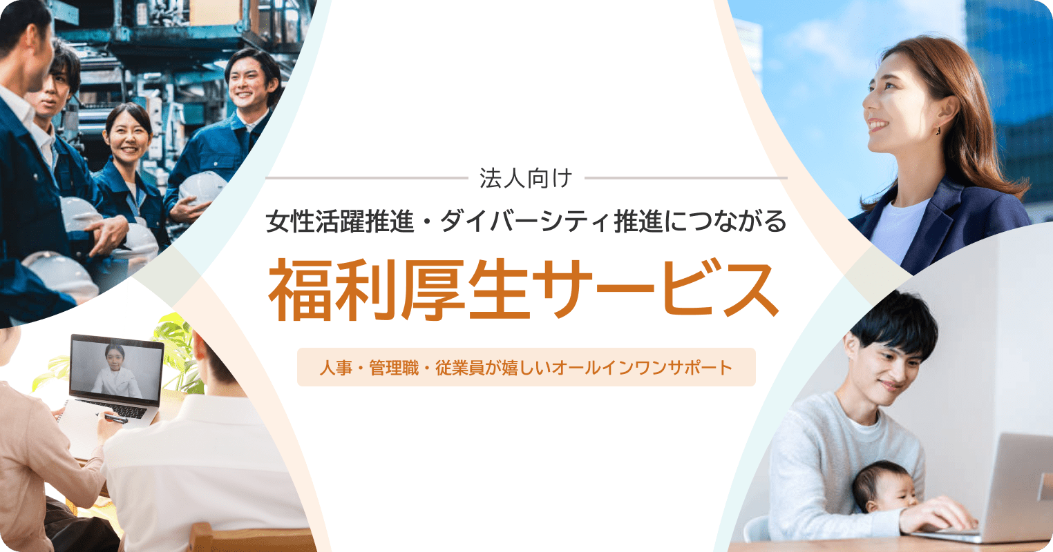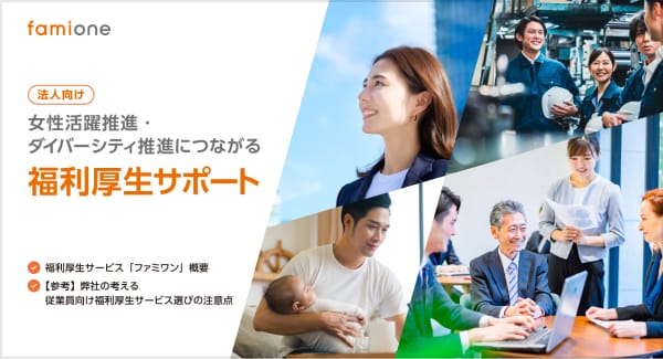 ファミワンでは法人向けサービスとして、女性活躍推進を軸としたダイバーシティ経営を支援する法人向けプログラム『福利厚生サポート』サービスをご提供いたしております。従業員のヘルスリテラシー向上や、組織風土の変容に役立つのみならず、利用促進の広報資料の作成までカバーしており、ご担当者様の負荷の削減にもつながります。