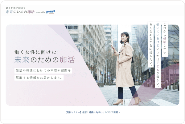 女性の社会活躍が進み、ライフスタイルが多様化する一方、出産年齢の高齢化等妊活と仕事の両立の難しさを抱えている女性も増えています。 そこで「卵活」を一つの選択肢と啓蒙するため、ロート製薬と協業し、働く女性へ「未来のための卵活」を提案、特設ページの開設や、卵活の重要性に関するセミナーを開催しました。